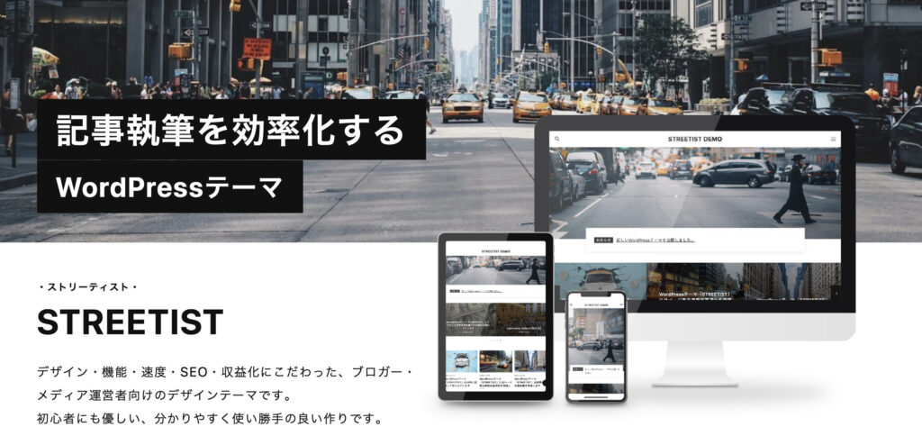 STREETISTはブログ・メディアサイトを長年運営してきた開発者によって作られているWordPressテーマで収益を上げるために必要な機能が数多く搭載されているにも関わらず、初心者でも簡単に使うことができるという魅力的なテーマとなっています(ΦωΦ)フフフ・・